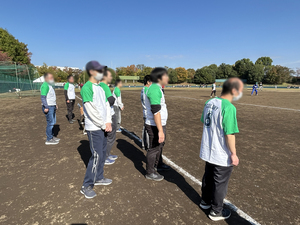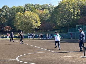 車で来場された方と合流し、みんなでキャッチボールをしてウォーミングアップ。自分のボールは届かず、コントロールもひどくて「ごめんなさい!」と叫んでばかり。雲のあいだから陽が差しはじめたころに開会式。今年も出場は4チーム。出場するとベスト4に入れます。試合開始前に自分の守備位置を確認して、打つ練習もできました。体も心もほぐれて、いざプレーボール!!